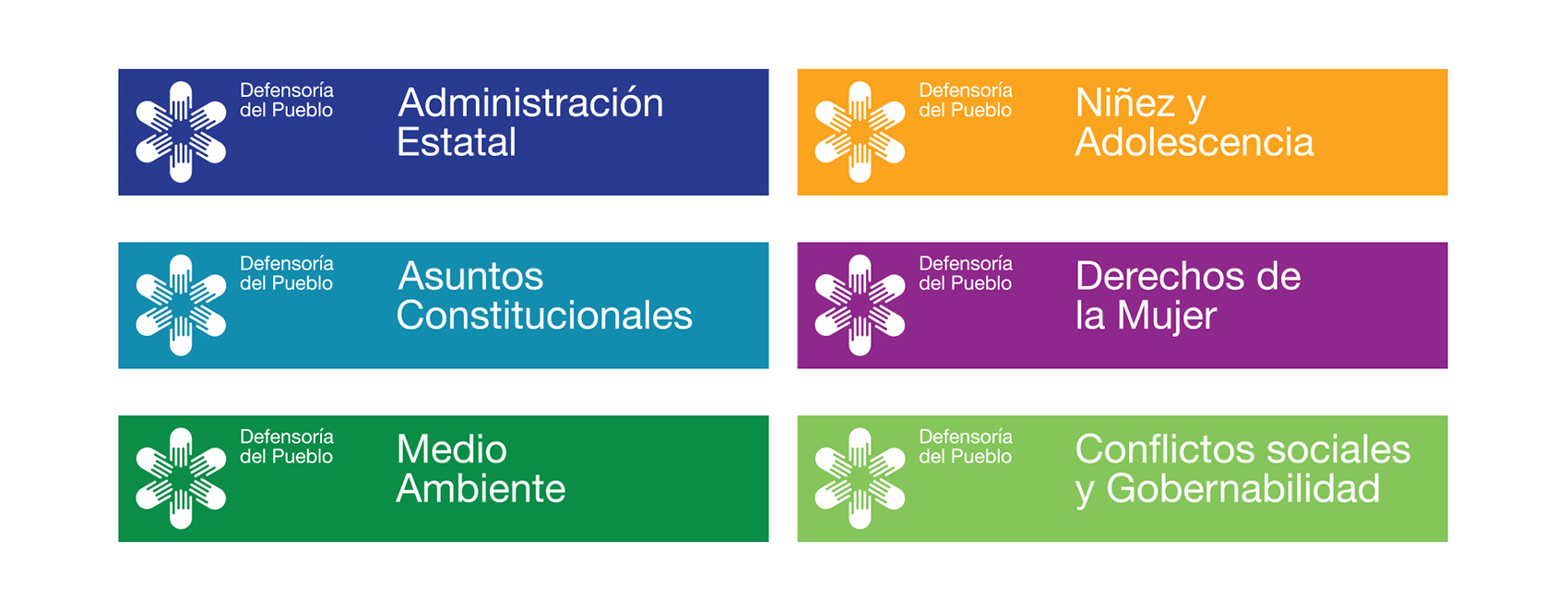 The mission of the Ombudsman Office is to safeguard and champion the rights of individuals and the community by overseeing State obligations. The logo depicts six adjunct offices, covering areas such as Women’s Rights, Public Services, Indigenous Peoples, Childhood and Adolescence, etc. The hands in the logo symbolize presence, while the flower represents an embroidery pattern from Ayacucho that confronted significant challenges in the 1980s. This system, structured like a puzzle, is designed for clear and effective communication within diverse institutions and communities across Peru.