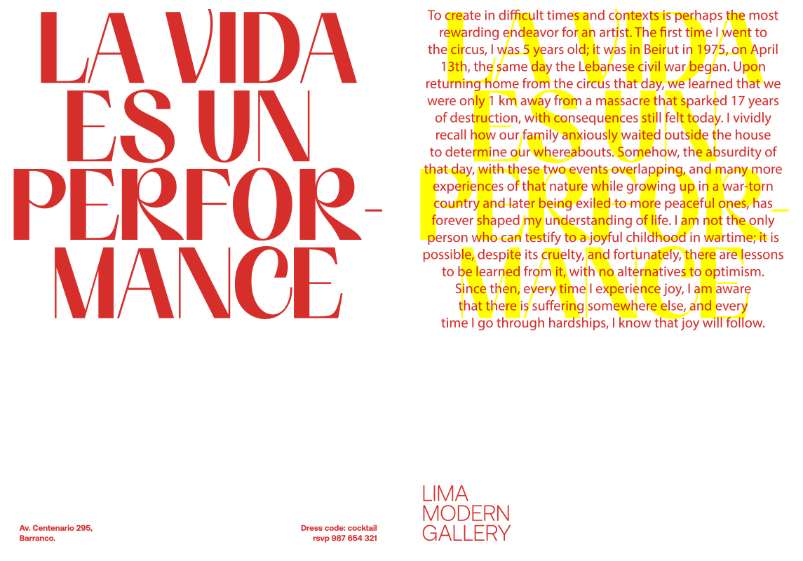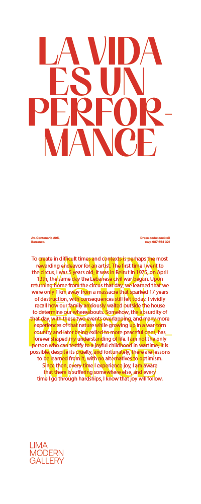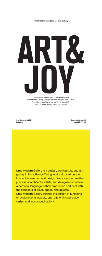 Lima Modern Gallery, located in Lima, Peru, is a dynamic space that seamlessly blends design, architecture, and art. The gallery highlights the creative processes of architects, artists, and designers with distinctive personal languages. Lima Modern Gallery curates a diverse collection that includes functional objects, unique one-offs, limited-edition series, and publications. We developed for LMG print and digital design pieces tailored for international art fairs and big celebrations.
